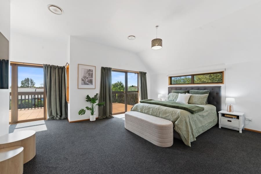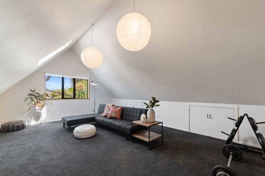 Four bedrooms, two up and two down, are serviced by three bathrooms, with living spaces commensurate with a growing family. Constructed in the era of extravagant sized rooms, two huge living spaces are interconnecting but can be separated with sliding doors. An enormous rumpus room over the garage will have a myriad of uses for families. A Chef’s kitchen is sleek in black and white with a lustrous stone benchtop, and wide, solid timber planks underfoot. The master suite is palatial, opening through two sets of French doors onto a sundrenched deck overlooking the garden below. Heat pumps are ducted upstairs for heating and cooling in Summer, and there is a log burner and heat pump in the living areas.