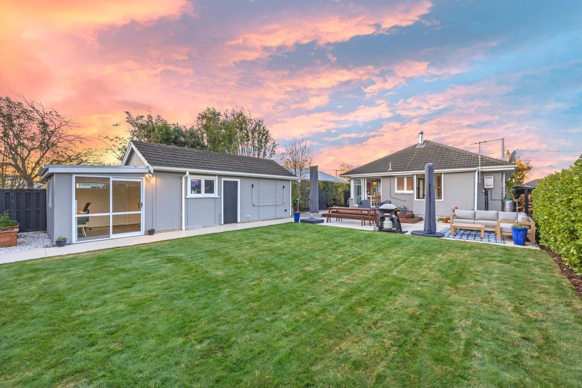 A sliding door draws the space outward to a sun-driven Kwila deck and a spacious terrace that handles the shift from quiet evenings to full-house hosting, while a generous run of lawn keeps outdoor living firmly in play.