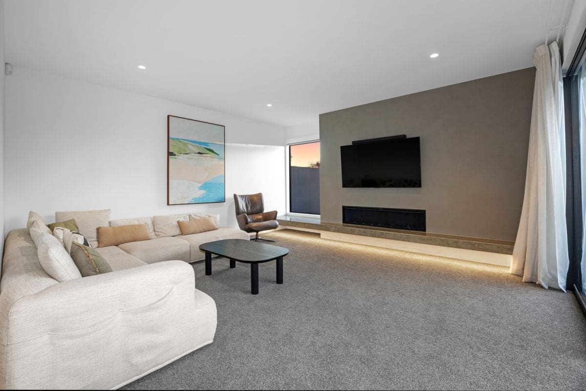 The lounge brings in another layer of living and settles into a more relaxed rhythm, with a gas fire and ambient strip lighting lifting the evening mood, while a slider opens wide and the deck extends the space outdoors when hosting takes hold.