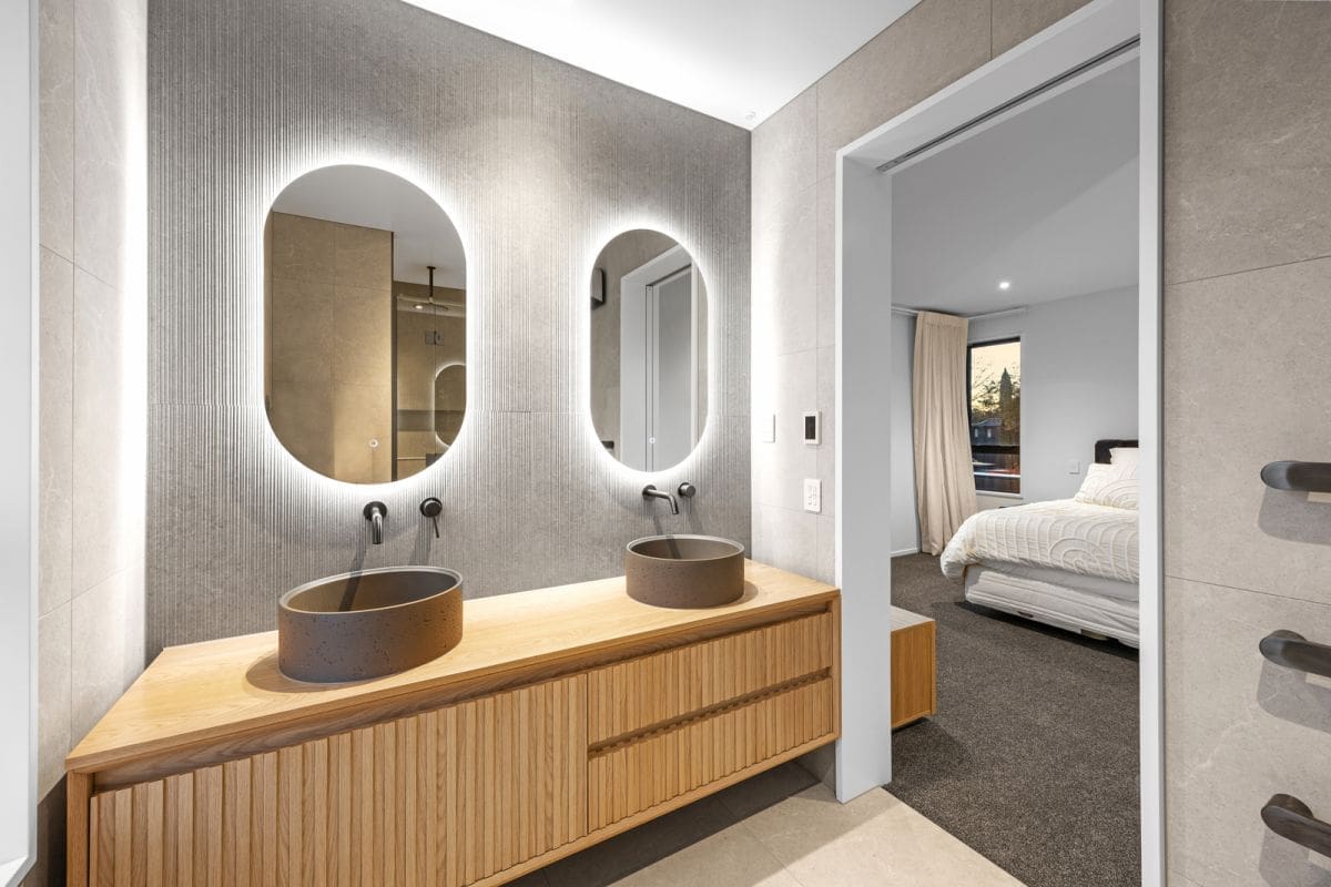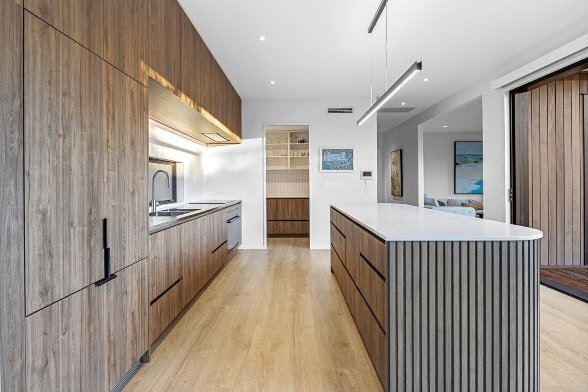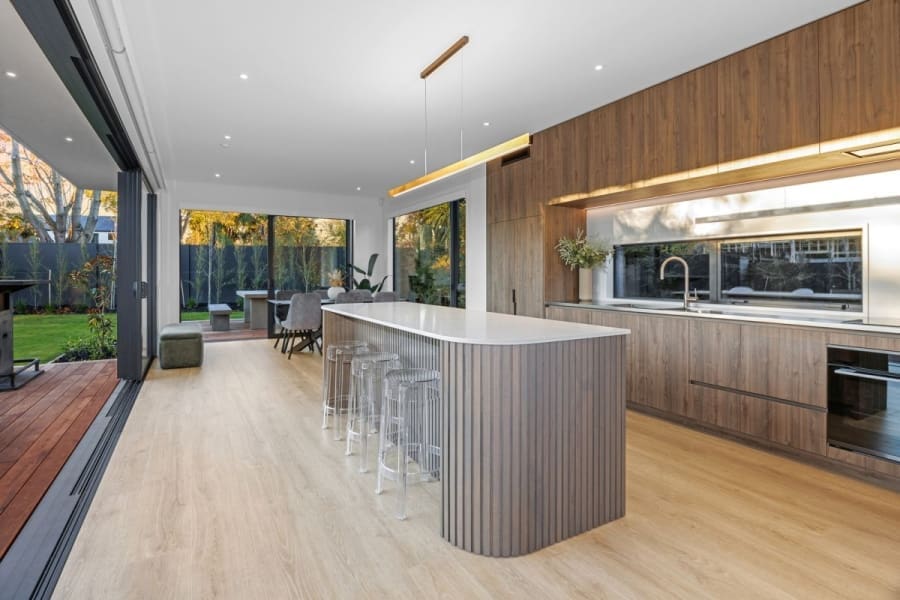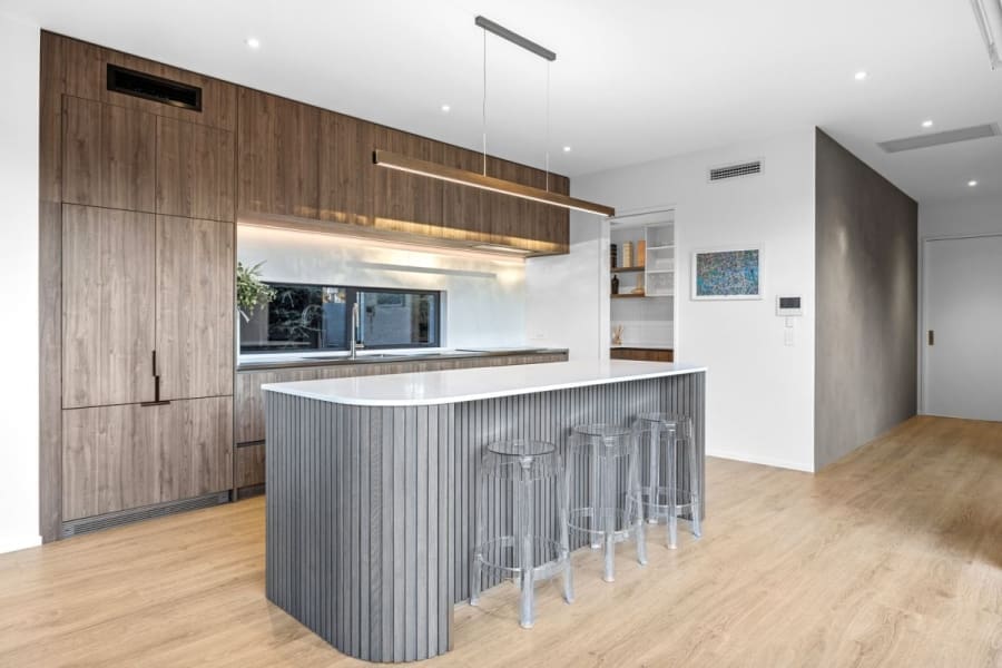 Texture and tone drive the design direction, with the living layout gathering around an aesthetically exceptional kitchen, where a fluted and curved entertainer’s island forms the centre, complemented by a streamlined finish and the support of a scullery.