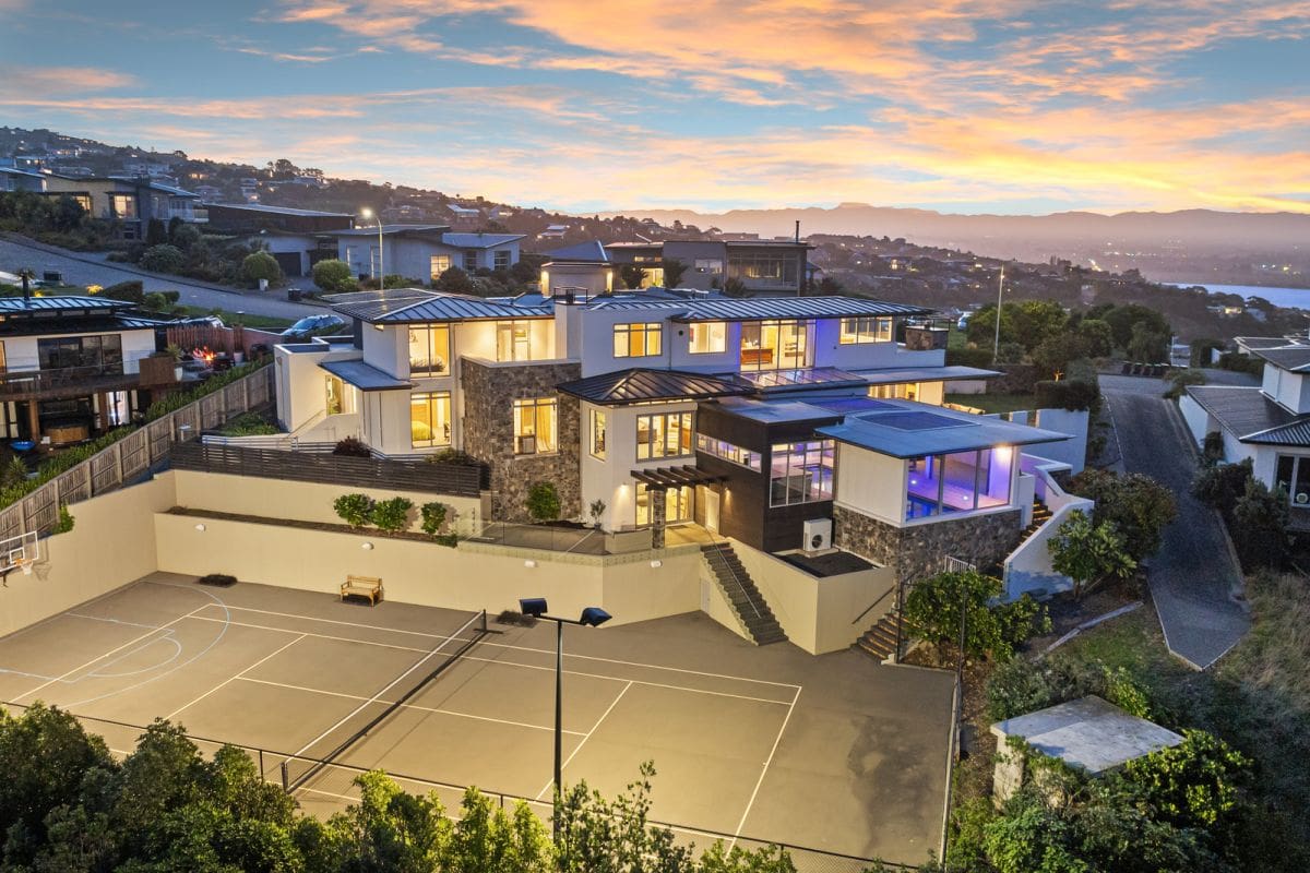 An entertainers paradise, indoor and outdoor living options are plentiful and diverse. There are outdoor spaces for any weather and on all sides, whether you are watching a match on the floodlit tennis court, enjoying all day sun on the ‘sundeck’ beside the pool, or relaxing in the evening catching the last of the setting sun. The indoor pool can be opened entirely on one side facing north, onto decking, and electric louvres in the roof permit natural sunlight. On the ‘entertaining level’, the home theatre comes complete with seating, screen and projector, there is a lounge with a Bar, and a wine tasting room. Set on 2186sqm of land, two separate sets of double garaging with separate driveways, are both oversize, with room for a workshop and a gym.