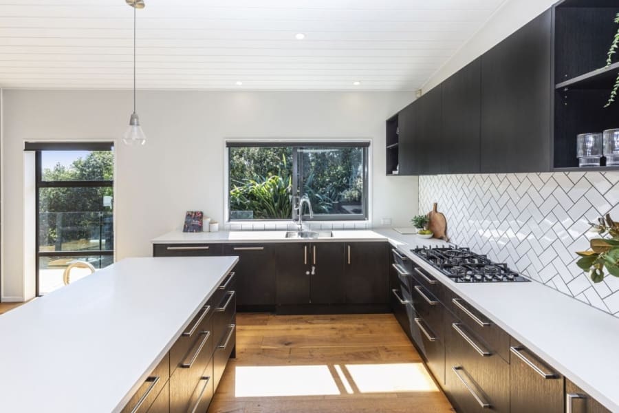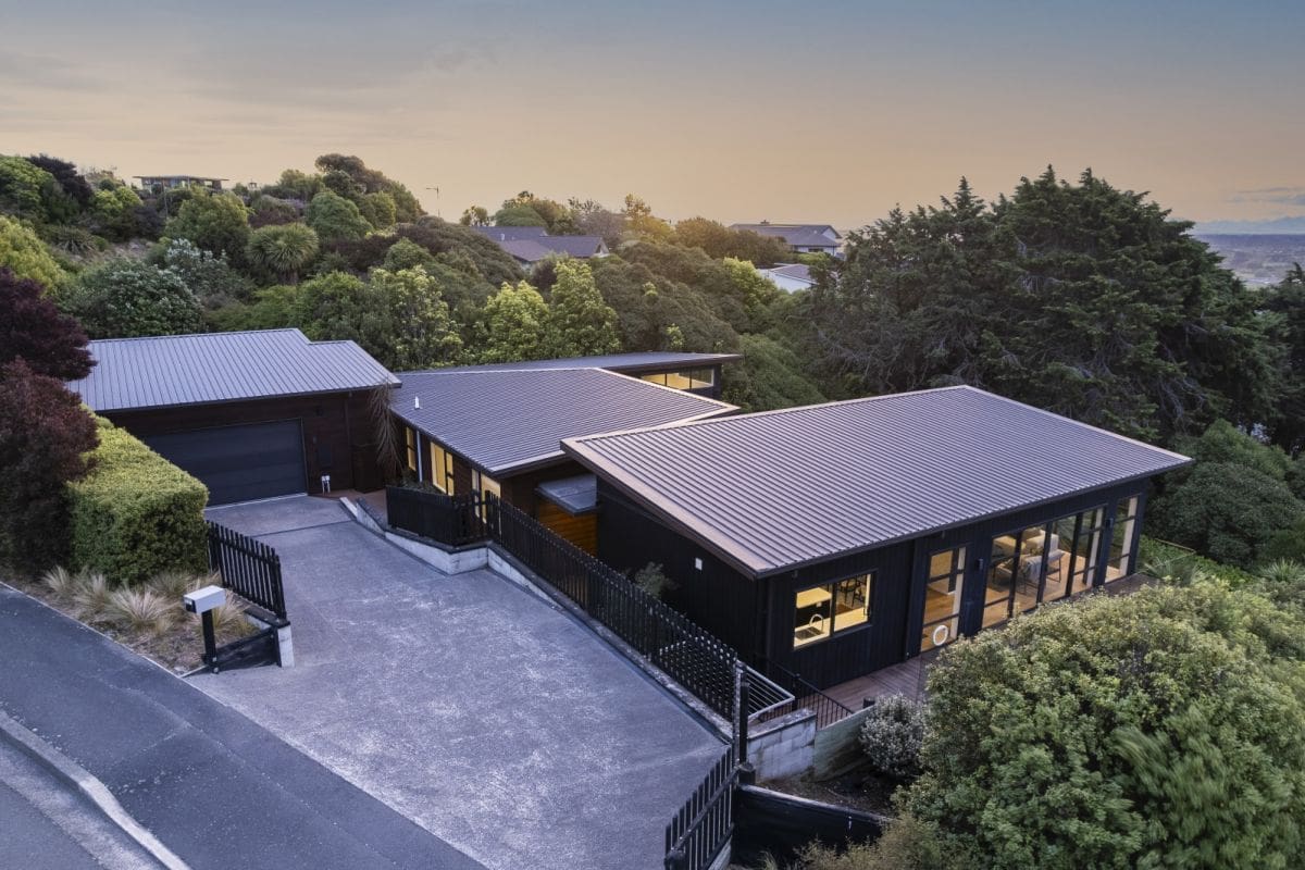 Nestled high on Kennedy’s Bush Road, you’re invited to discover, among the trees and bush, a completely private property. Set on a gently sloping 1386sqm, the house – built in 2015 – while elevated, is set across a single level with a mono-pitch roofline creating high ceilings and seemingly acres of glass. Three of the ‘pavilions’ are formed in a U shape around huge central decking, facing north-west, it is sun-drenched and sheltered. Vast sliding doors on three sides open to this ‘interior courtyard’ allowing indoor outdoor ebb and flow almost year-round.