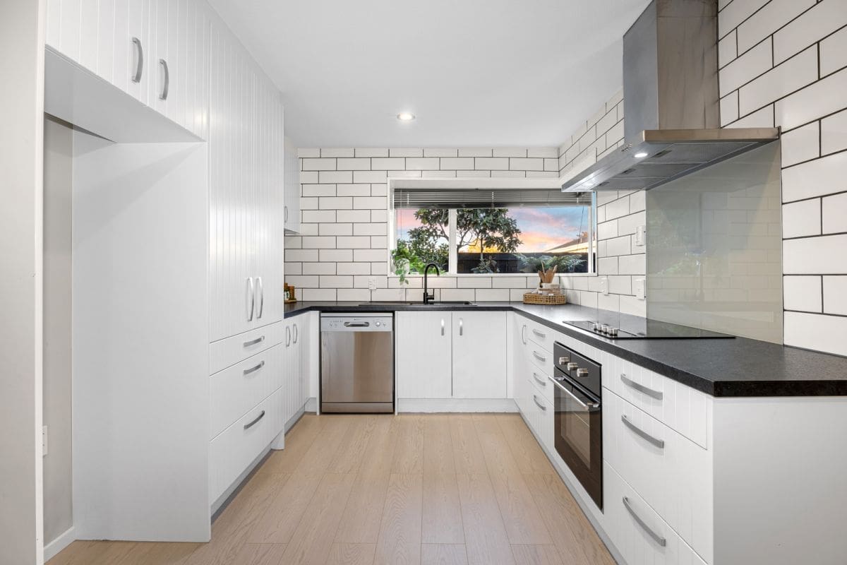 A fully tiled bathroom leads the upgrade, with statement subway tiling carrying that same clean-lined edge through to the kitchen.